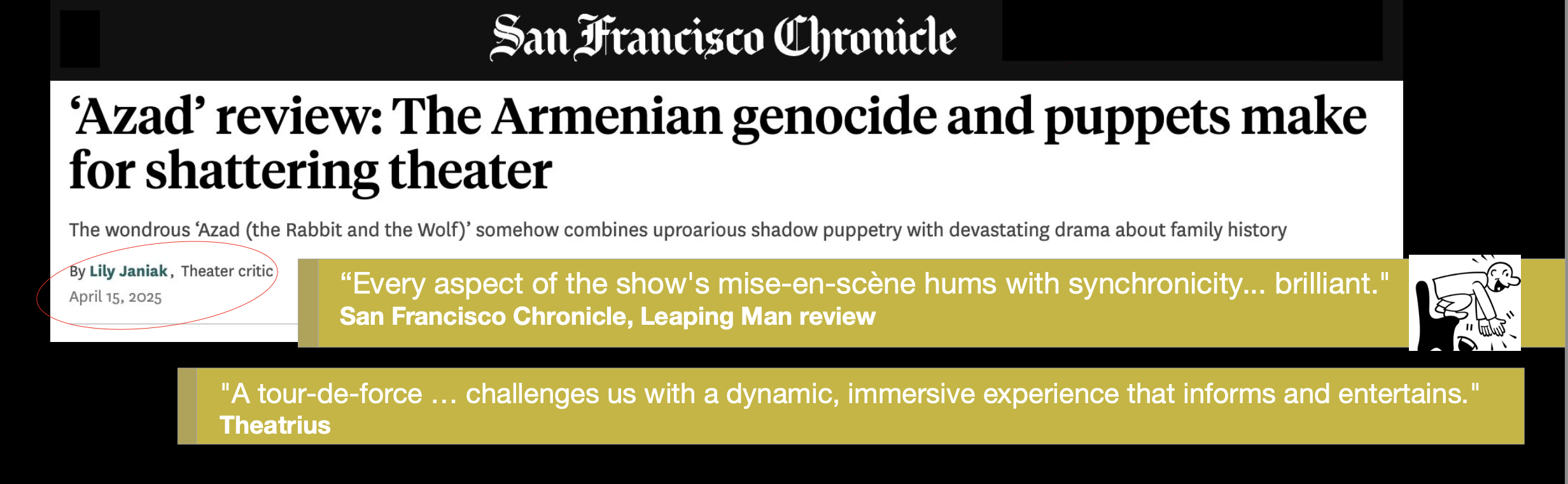 A timely, kaleidoscopic multimedia play performed with 120-year-old Karagöz shadow puppets that survived the Armenian Genocide, discovered in a magic box in war-torn Aleppo.